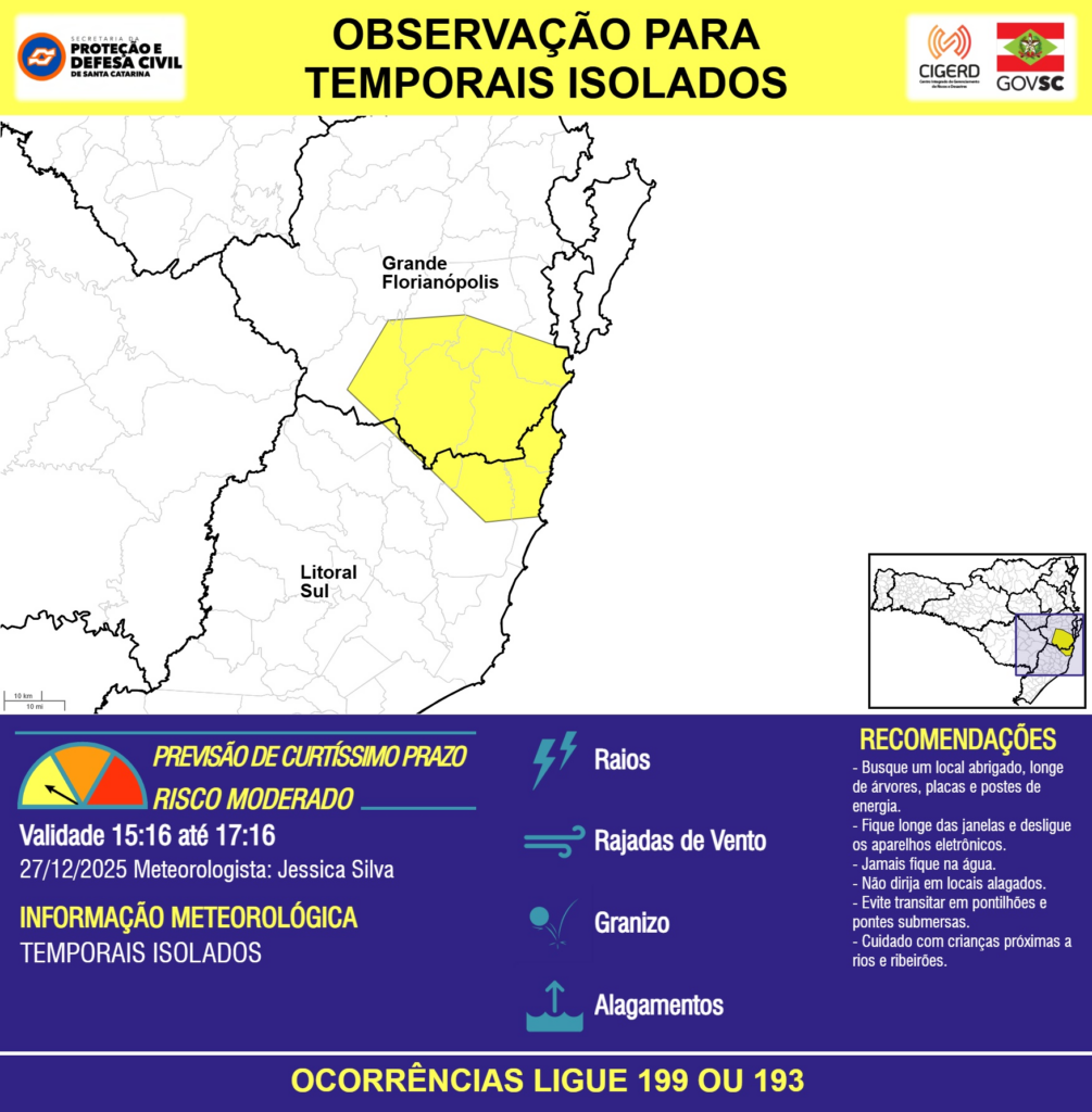 OBSERVAÇÃO – 27/12 15:16 – TEMPORAIS ISOLADOS com RAIOS, RAJADAS DE VENTO, GRANIZO e ALAGAMENTOS pontuais para as regiões do Litoral Sul e Grande Florianópolis nas próximas 2 horas. Ocorrências ligue 199 ou 193.