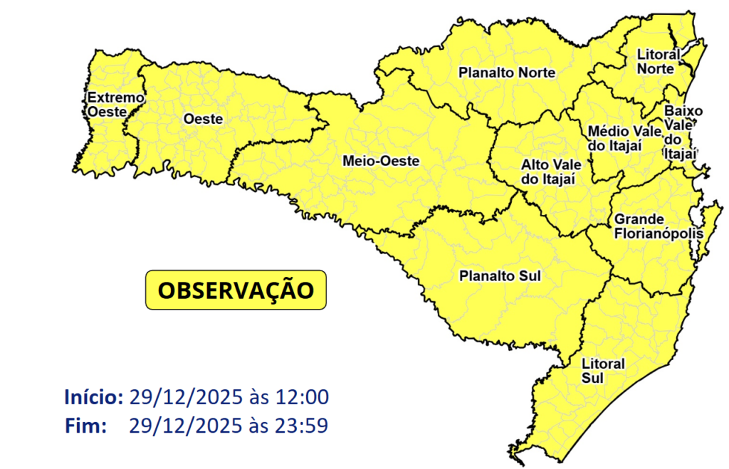 Neste dia, a combinação do calor com a circulação dos ventos em diferentes níveis da atmosfera, favorce o desenvolvimento de temporais em todas as regiões. As instabilidades iniciam no Grande Oeste e avançam para as demais regiões catarinenses ao longo das horas, chegando às áreas litorâneas no final da tarde e começo da noite.