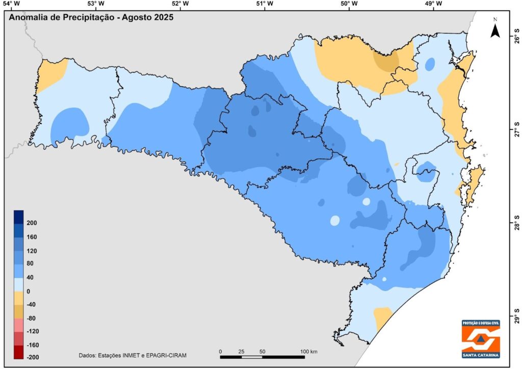 O mês de agosto de 2025 foi marcado pela irregularidade das chuvas em Santa Catarina. Por outro lado, os volumes registrados ficaram acima da média climatológica para o período, conforme apresentado na Figura 1.
