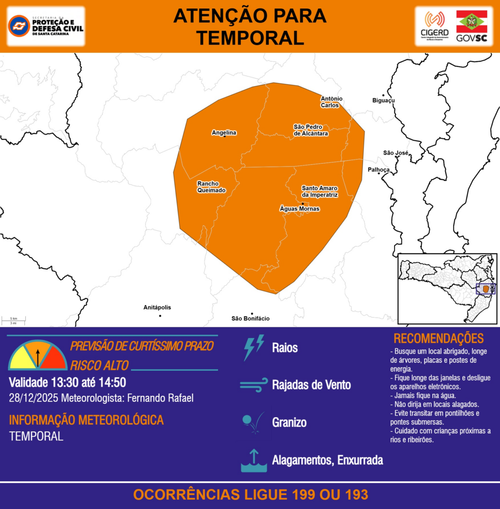 ATENÇÃO – 28/12 13:30 – TEMPORAL com RAIOS, RAJADAS DE VENTO, GRANIZO, ALAGAMENTOS e risco de ENXURRADA para os municípios de Angelina, Anitápolis, Antônio Carlos, Biguaçu, Palhoça, Rancho Queimado, Santo Amaro da Imperatriz, São Bonifácio, São José, São Pedro de Alcântara e Águas Mornas na próxima hora. Ocorrências ligue 199 ou 193.