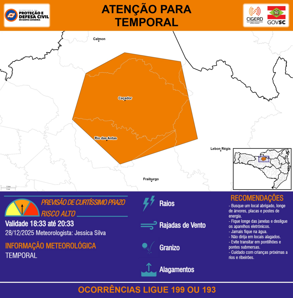 ATENÇÃO – 28/12 18:33 – TEMPORAL com RAIOS, RAJADAS DE VENTO, GRANIZO e ALAGAMENTOS para os municípios de Calmon, Caçador, Fraiburgo, Lebon Régis e Rio das Antas nas próximas 2 horas. Ocorrências ligue 199 ou 193.