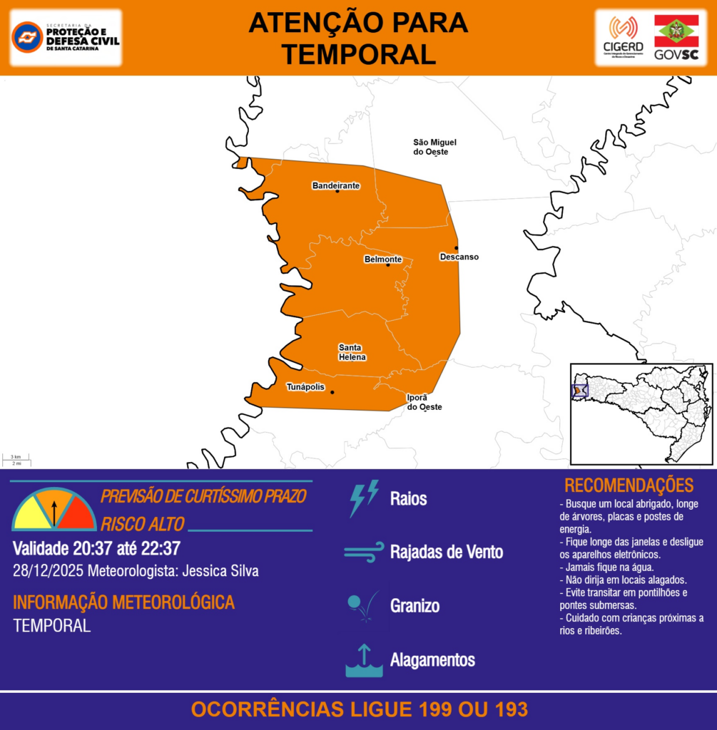 ATENÇÃO – 28/12 20:37 – TEMPORAL com RAIOS, RAJADAS DE VENTO, GRANIZO e ALAGAMENTOS para os municípios de Bandeirante, Belmonte, Descanso, Iporã do Oeste, Paraíso, Santa Helena, São Miguel do Oeste e Tunápolis nas próximas 2 horas. Ocorrências ligue 199 ou 193.