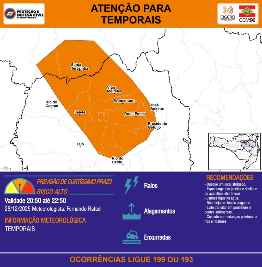 ATENÇÃO – 28/12 20:50 – TEMPORAIS com RAIOS, ALAGAMENTOS e risco de ENXURRADAS para os municípios de Dona Emma, José Boiteux, Papanduva, Presidente Getúlio, Rio do Campo, Rio do Oeste, Salete, Santa Terezinha, Taió, Vitor Meireles e Witmarsum nas próximas 2 horas. Ocorrências ligue 199 ou 193.