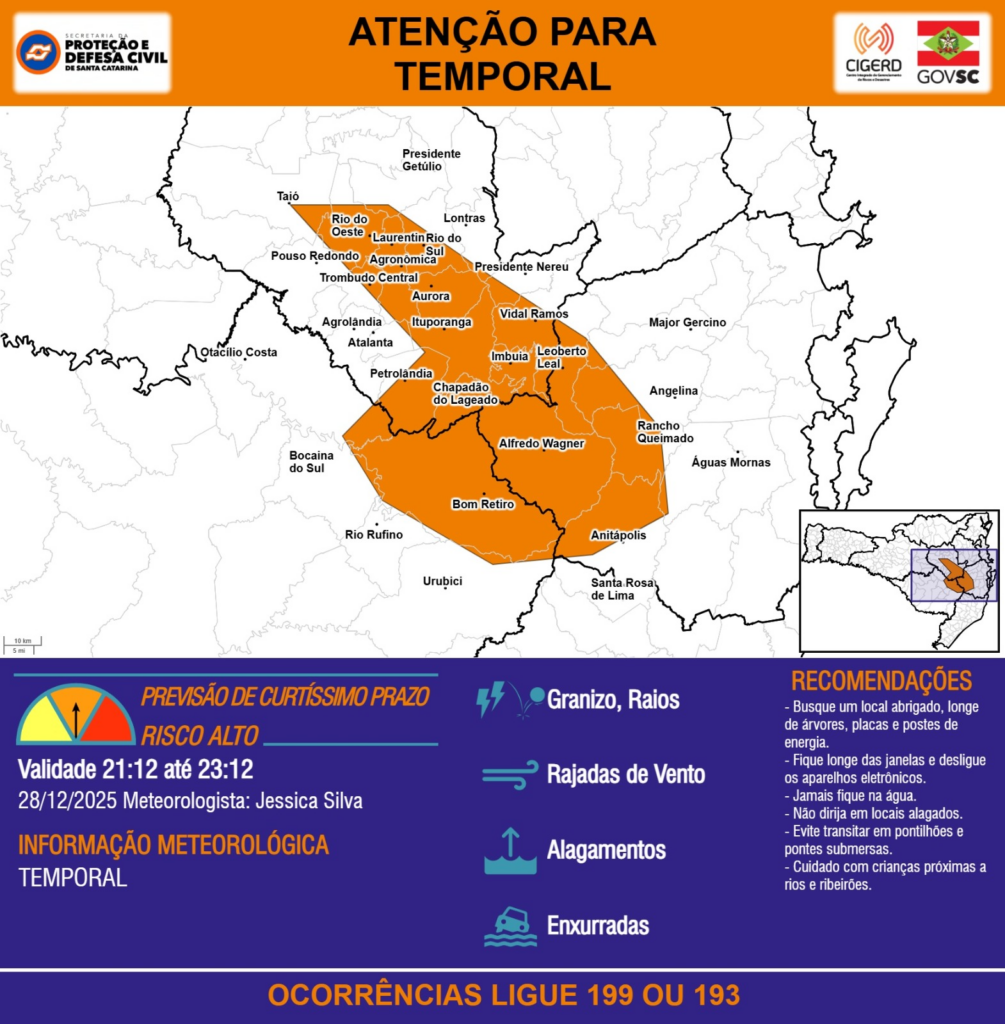 ATENÇÃO – 28/12 21:12 – TEMPORAL com RAJADAS DE VENTO, ALAGAMENTOS, GRANIZO, RAIOS e risco de ENXURRADAS para os municípios de Agrolândia, Agronômica, Alfredo Wagner, Angelina, Anitápolis, Atalanta, Aurora, Bocaina do Sul, Bom Retiro, Chapadão do Lageado, Imbuia, Ituporanga, Laurentino, Leoberto Leal, Lontras, Major Gercino, Otacílio Costa, Petrolândia, Pouso Redondo, Presidente Getúlio, Presidente Nereu, Rancho Queimado, Rio Rufino, Rio do Oeste, Rio do Sul, Santa Rosa de Lima, Taió, Trombudo Central, Urubici, Vidal Ramos e Águas Mornas nas próximas 2 horas. Ocorrências ligue 199 ou 193.