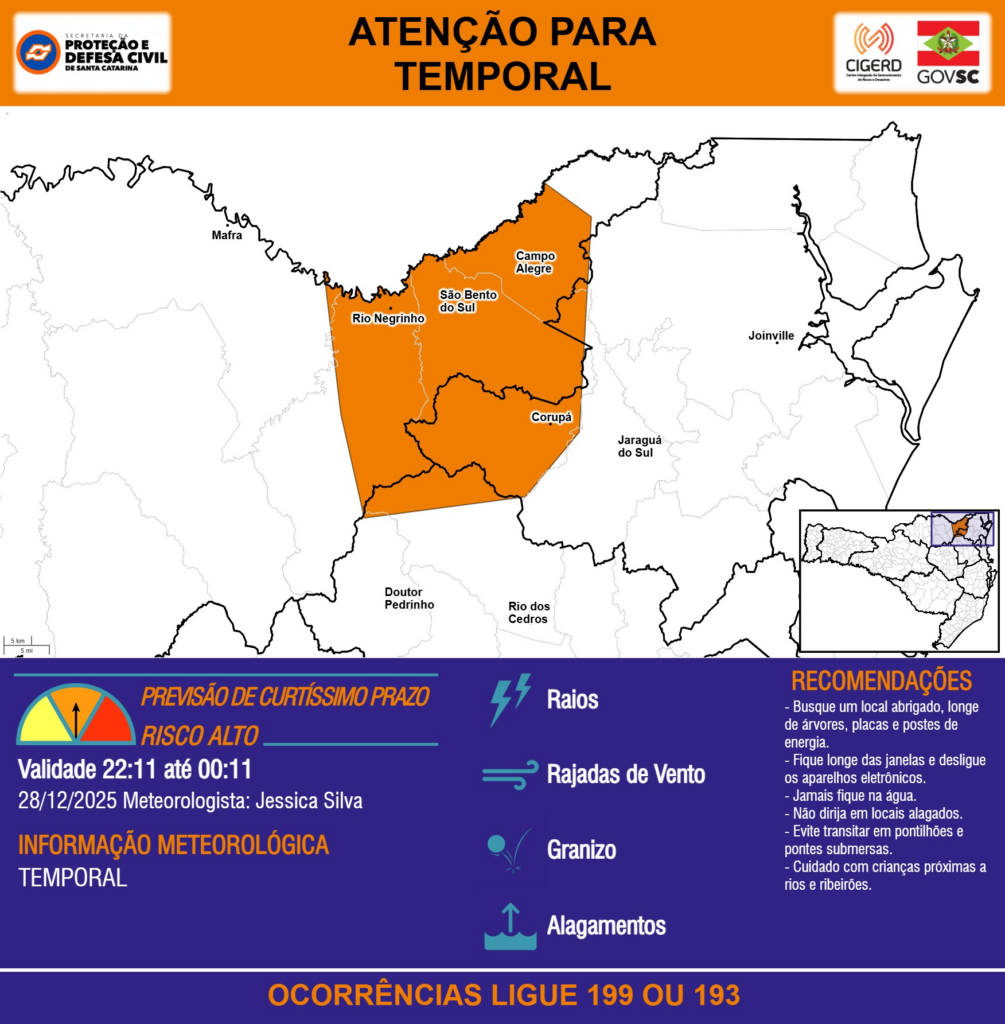 ATENÇÃO – 28/12 22:11 – TEMPORAL com RAIOS, RAJADAS DE VENTO, GRANIZO e ALAGAMENTOS para os municípios de Campo Alegre, Corupá, Doutor Pedrinho, Jaraguá do Sul, Joinville, Mafra, Rio Negrinho, Rio dos Cedros e São Bento do Sul nas próximas 2 horas. Ocorrências ligue 199 ou 193.