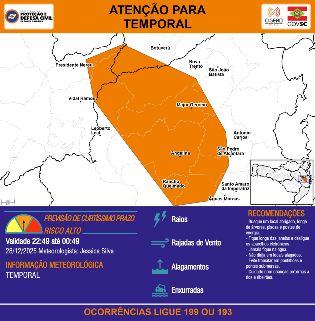 ATENÇÃO – 28/12 22:49 – TEMPORAL com RAIOS, RAJADAS DE VENTO, ALAGAMENTOS e risco de ENXURRADAS para os municípios de Angelina, Antônio Carlos, Botuverá, Leoberto Leal, Major Gercino, Nova Trento, Presidente Nereu, Rancho Queimado, Santo Amaro da Imperatriz, São João Batista, São Pedro de Alcântara, Vidal Ramos e Águas Mornas nas próximas 2 horas. Ocorrências ligue 199 ou 193.