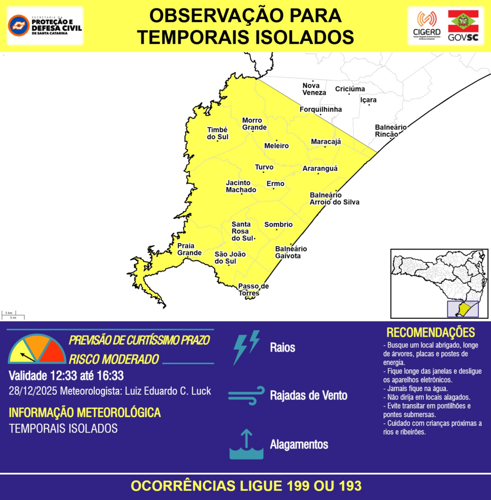 OBSERVAÇÃO – 28/12 12:33 – TEMPORAIS ISOLADOS com RAIOS, RAJADAS DE VENTO e ALAGAMENTOS pontuais para os municípios de Araranguá, Balneário Arroio do Silva, Balneário Gaivota, Balneário Rincão, Criciúma, Ermo, Forquilhinha, Içara, Jacinto Machado, Maracajá, Meleiro, Morro Grande, Nova Veneza, Passo de Torres, Praia Grande, Santa Rosa do Sul, Sombrio, São João do Sul, Timbé do Sul e Turvo nas próximas 4 horas. Ocorrências ligue 199 ou 193.