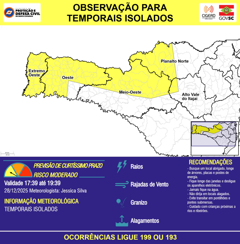 OBSERVAÇÃO – 28/12 17:39 – TEMPORAIS ISOLADOS com RAIOS, RAJADAS DE VENTO, GRANIZO e ALAGAMENTOS pontuais para as regiões do Extremo Oeste, Oeste, Meio-Oeste, Planalto Norte e Alto Vale do Itajaí nas próximas 2 horas. Ocorrências ligue 199 ou 193.