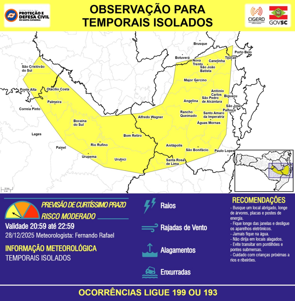OBSERVAÇÃO – 28/12 20:59 – TEMPORAIS ISOLADOS com RAIOS, RAJADAS DE VENTO, ALAGAMENTOS pontuais e risco de ENXURRADAS para os municípios de Alfredo Wagner, Angelina, Anitápolis, Antônio Carlos, Biguaçu, Bocaina do Sul, Bom Retiro, Botuverá, Brusque, Canelinha, Correia Pinto, Lages, Major Gercino, Nova Trento, Otacílio Costa, Painel, Palhoça, Palmeira, Paulo Lopes, Ponte Alta, Porto Belo, Rancho Queimado, Rio Rufino, Santa Rosa de Lima, Santo Amaro da Imperatriz, São Bonifácio, São Cristóvão do Sul, São José, São João Batista, São Pedro de Alcântara, Tijucas, Urubici, Urupema e Águas Mornas nas próximas 2 horas. Ocorrências ligue 199 ou 193.