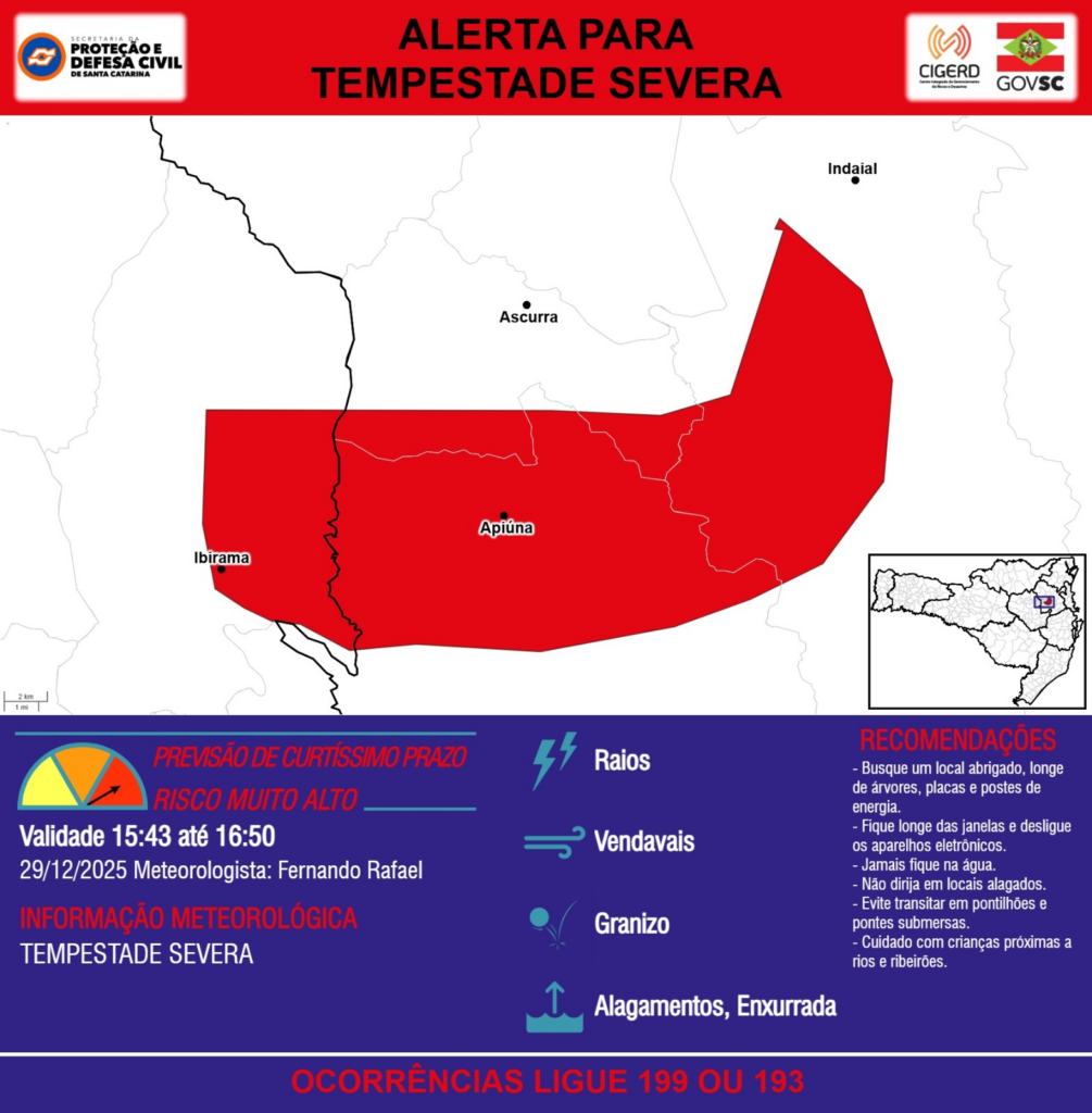 ALERTA – 29/12 15:43 – TEMPESTADE SEVERA com RAIOS, VENDAVAIS, GRANIZO, ALAGAMENTOS e risco de ENXURRADA para os municípios de Apiúna, Ascurra, Ibirama e Indaial na próxima hora. Ocorrências ligue 199 ou 193.