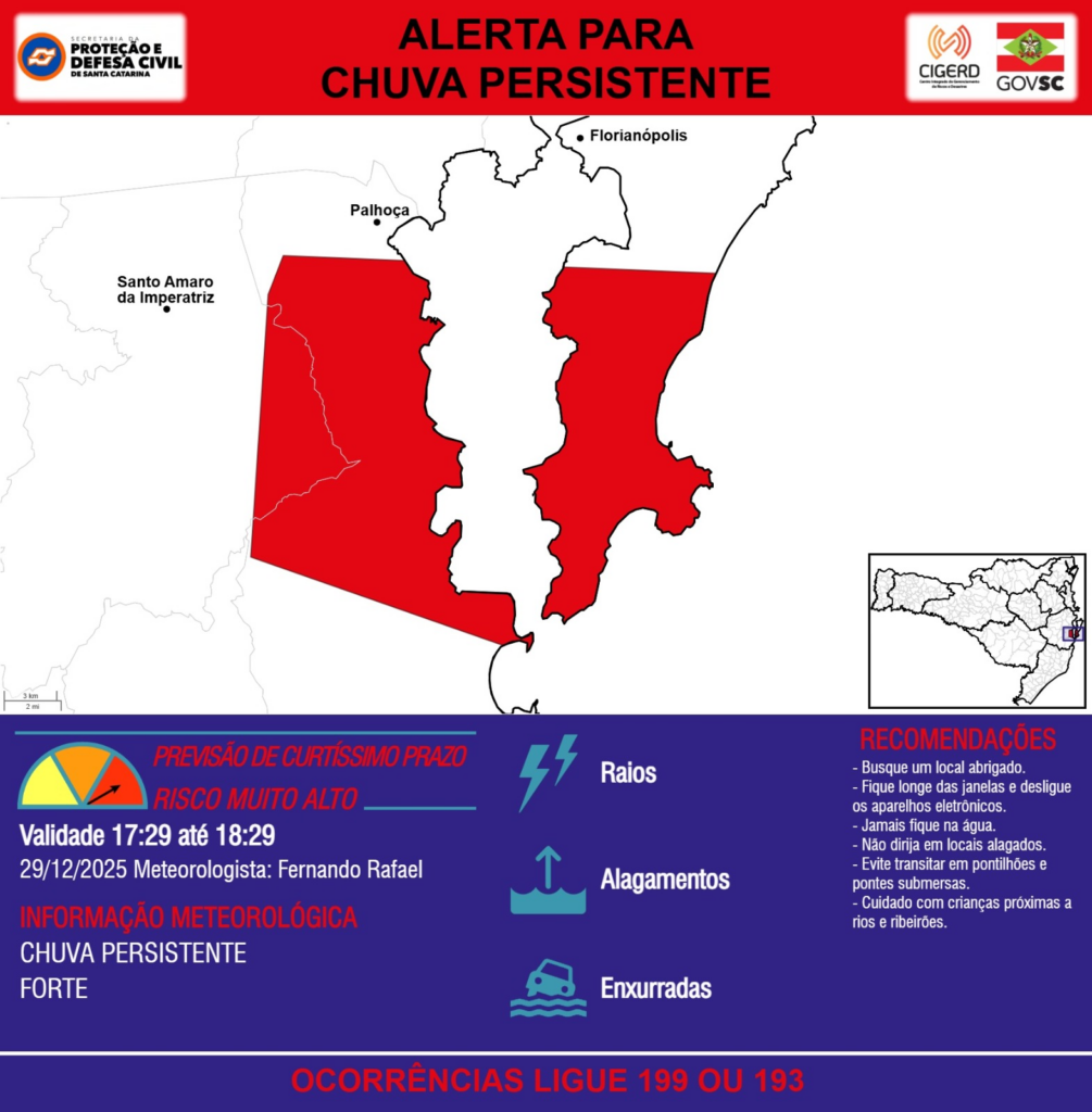 ALERTA – 29/12 17:29 – CHUVA PERSISTENTE de intensidade forte com RAIOS, ALAGAMENTOS e risco de ENXURRADAS para os municípios de Florianópolis, Palhoça e Santo Amaro da Imperatriz na próxima hora. Ocorrências ligue 199 ou 193.