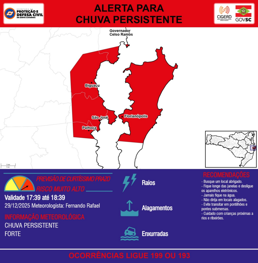 ALERTA – 29/12 17:39 – CHUVA PERSISTENTE de intensidade forte com RAIOS, ALAGAMENTOS e risco de ENXURRADAS para os municípios de Biguaçu, Florianópolis, Governador Celso Ramos, Palhoça e São José na próxima hora. Ocorrências ligue 199 ou 193.