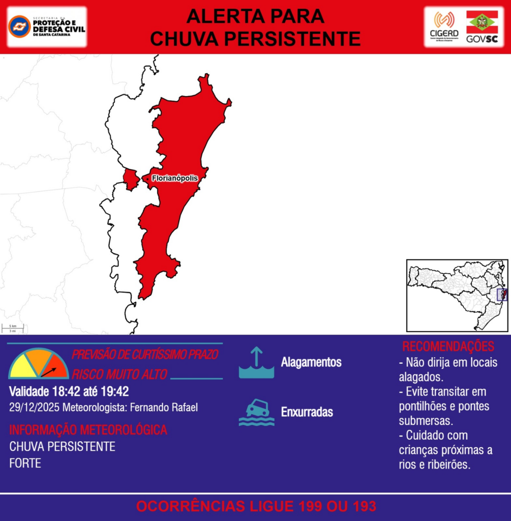ALERTA – 29/12 18:42 – CHUVA PERSISTENTE de intensidade forte com ALAGAMENTOS e risco de ENXURRADAS para o município de Florianópolis na próxima hora. Ocorrências ligue 199 ou 193.