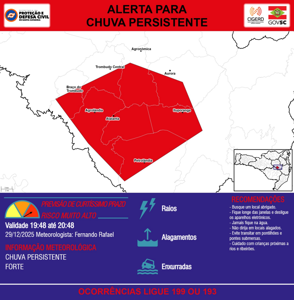 ALERTA – 29/12 19:48 – CHUVA PERSISTENTE de intensidade forte com RAIOS, ALAGAMENTOS e risco de ENXURRADAS para os municípios de Agrolândia, Agronômica, Atalanta, Aurora, Braço do Trombudo, Ituporanga, Petrolândia e Trombudo Central na próxima hora. Ocorrências ligue 199 ou 193.