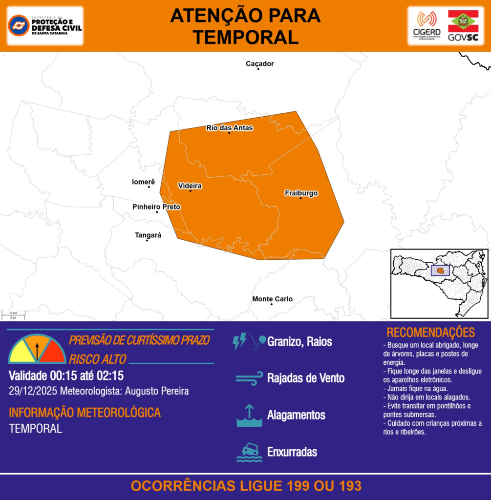 ATENÇÃO – 29/12 00:15 – TEMPORAL com RAJADAS DE VENTO, ALAGAMENTOS, GRANIZO, RAIOS e risco de ENXURRADAS para os municípios de Caçador, Fraiburgo, Iomerê, Monte Carlo, Pinheiro Preto, Rio das Antas, Tangará e Videira nas próximas 2 horas. Ocorrências ligue 199 ou 193.