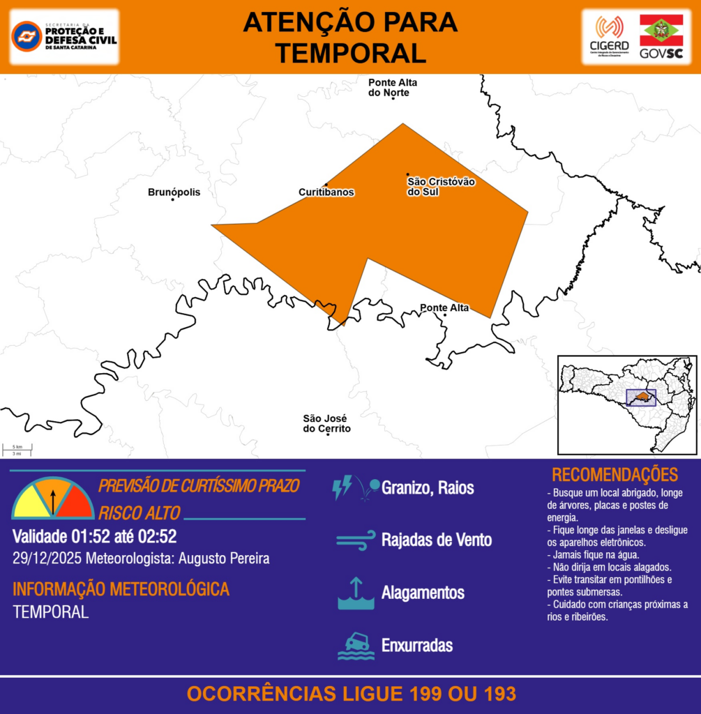 ATENÇÃO – 29/12 01:52 – TEMPORAL com RAJADAS DE VENTO, ALAGAMENTOS, GRANIZO, RAIOS e risco de ENXURRADAS para os municípios de Brunópolis, Curitibanos, Ponte Alta, Ponte Alta do Norte, São Cristóvão do Sul e São José do Cerrito na próxima hora. Ocorrências ligue 199 ou 193.