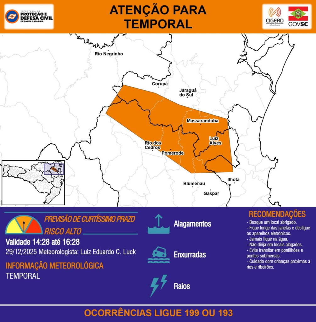 ATENÇÃO – 29/12 14:28 – TEMPORAL com ALAGAMENTOS, RAIOS e risco de ENXURRADAS para os municípios de Blumenau, Corupá, Gaspar, Ilhota, Jaraguá do Sul, Luiz Alves, Massaranduba, Pomerode, Rio Negrinho, Rio dos Cedros nas próximas 2 horas. Ocorrências ligue 199 ou 193.