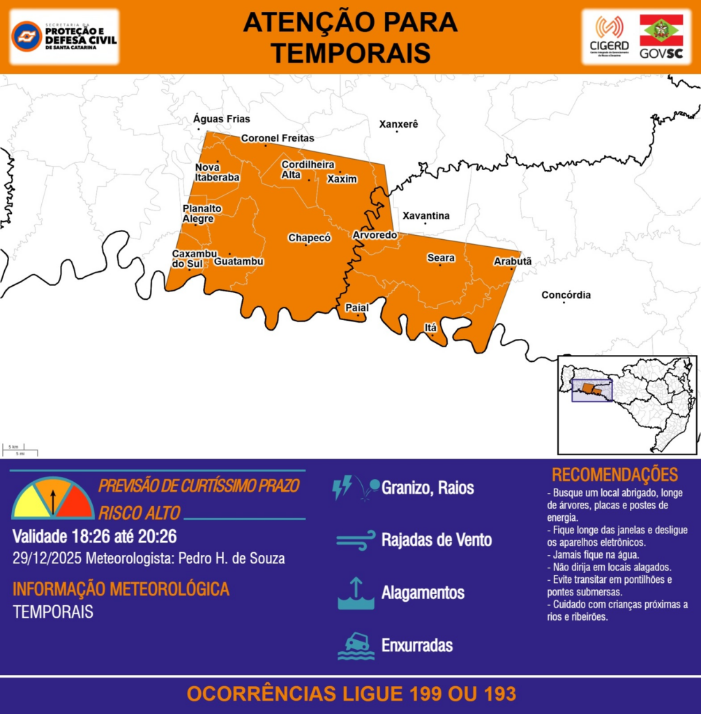 ATENÇÃO – 29/12 18:26 – TEMPORAIS com RAJADAS DE VENTO, ALAGAMENTOS, GRANIZO, RAIOS e risco de ENXURRADAS para áreas das regiões do Oeste e Meio-Oeste nas próximas 2 horas. Ocorrências ligue 199 ou 193.