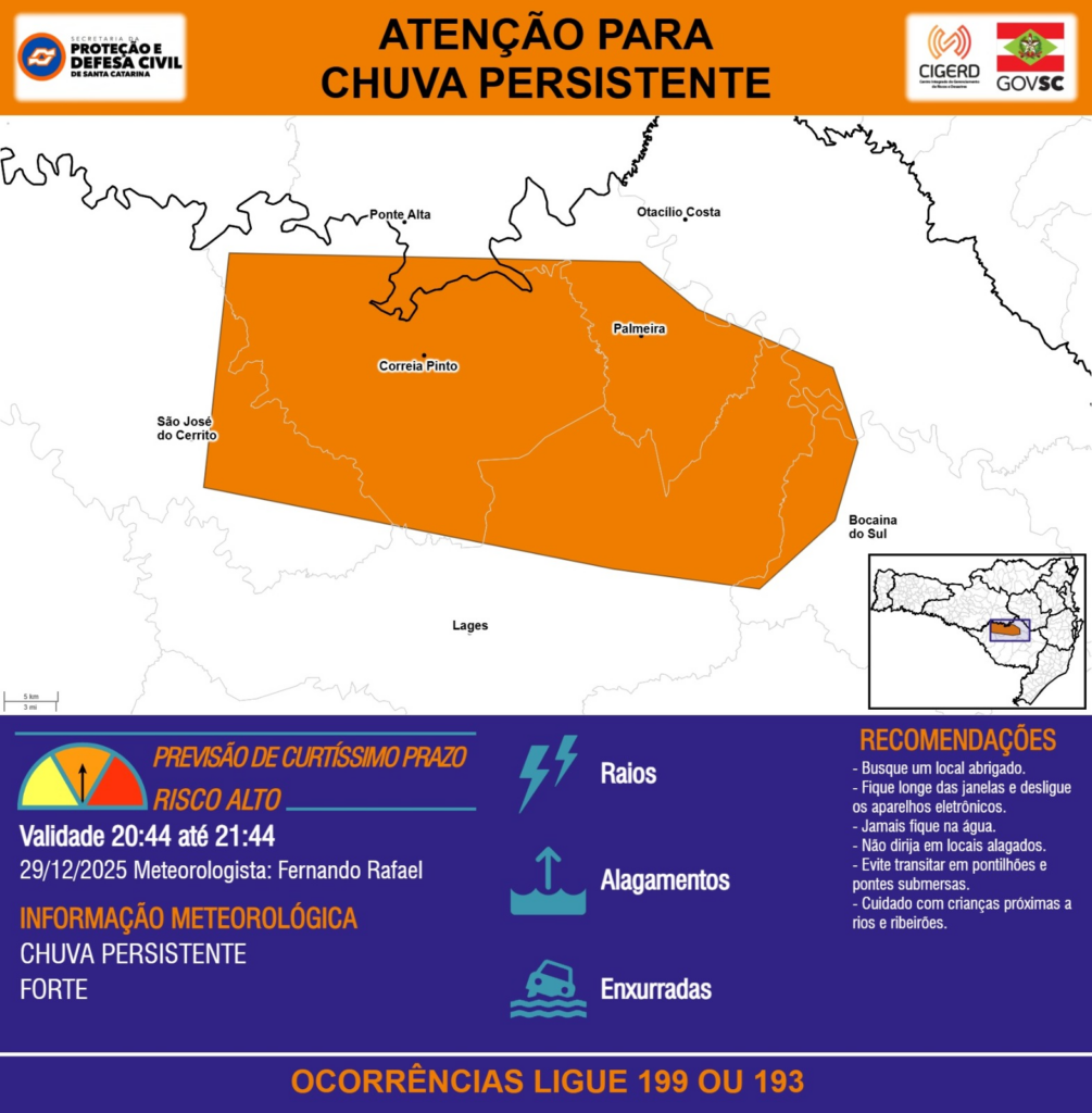 ATENÇÃO – 29/12 20:44 – CHUVA PERSISTENTE de intensidade forte com RAIOS, ALAGAMENTOS e risco de ENXURRADAS para os municípios de Bocaina do Sul, Correia Pinto, Lages, Otacílio Costa, Palmeira, Ponte Alta e São José do Cerrito na próxima hora. Ocorrências ligue 199 ou 193.