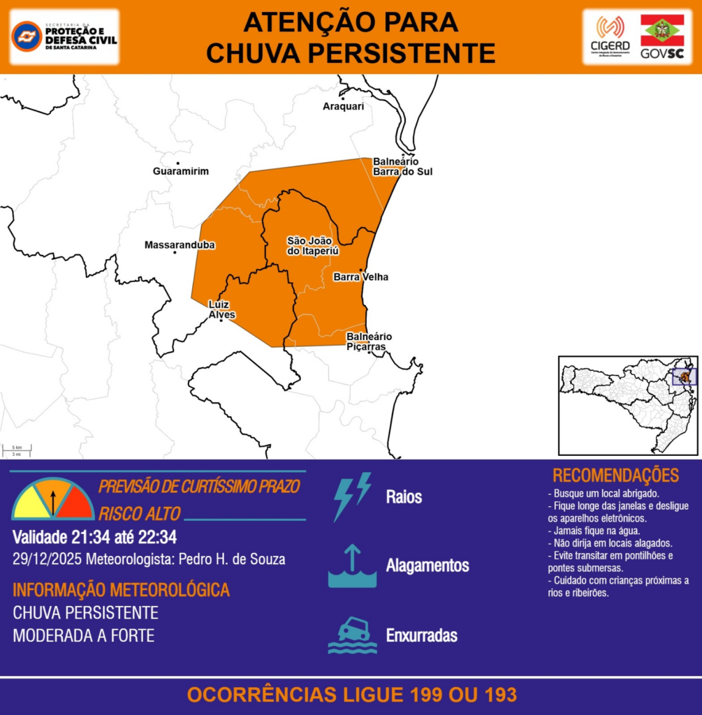 ATENÇÃO – 29/12 21:34 – CHUVA PERSISTENTE de intensidade moderada a forte com RAIOS, ALAGAMENTOS e risco de ENXURRADAS para os municípios de Araquari, Balneário Barra do Sul, Balneário Piçarras, Barra Velha, Guaramirim, Luiz Alves, Massaranduba e São João do Itaperiú na próxima hora. Ocorrências ligue 199 ou 193.