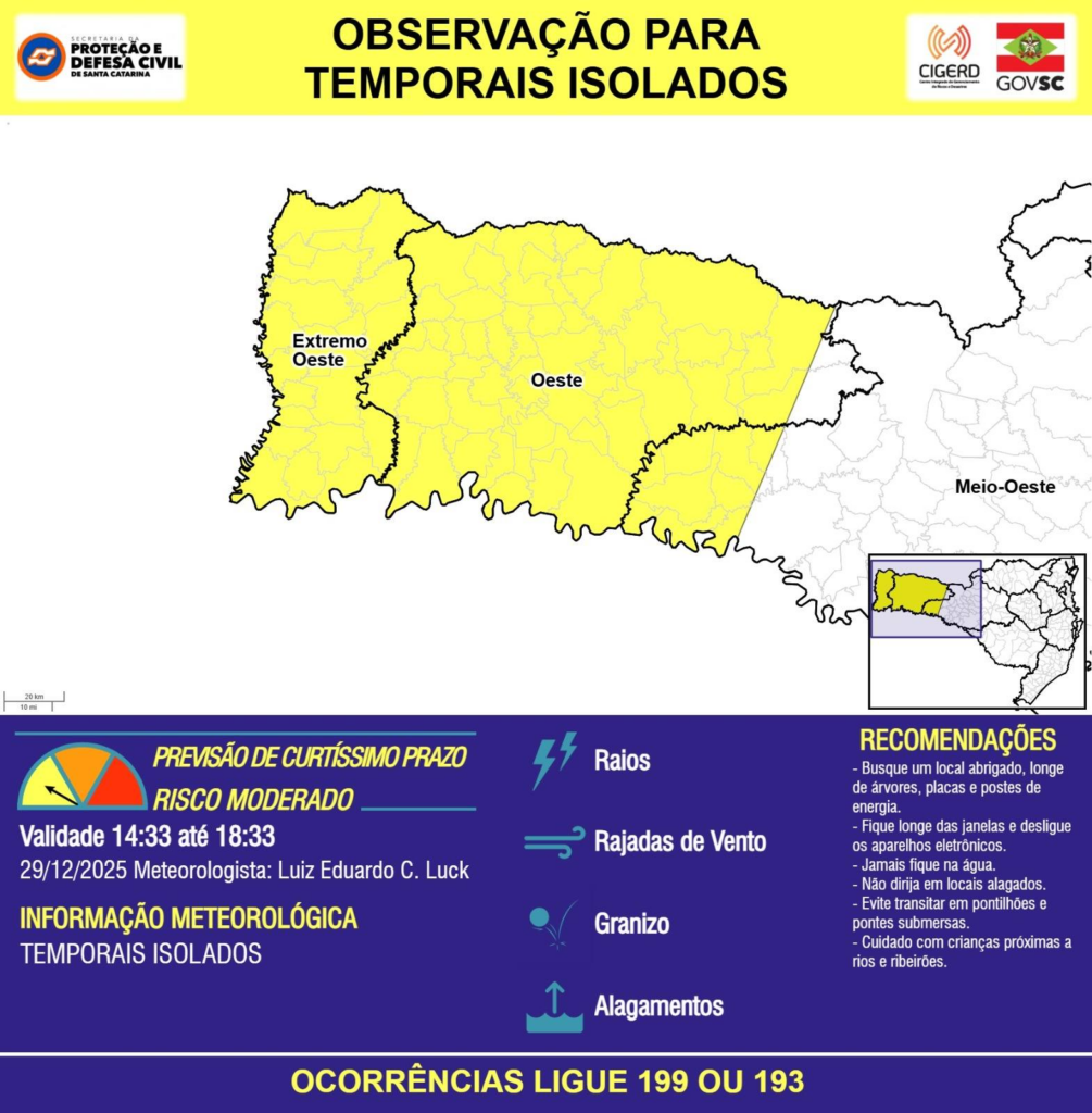 OBSERVAÇÃO – 29/12 14:33 – TEMPORAIS ISOLADOS com RAIOS, RAJADAS DE VENTO, GRANIZO e ALAGAMENTOS pontuais para as regiões do Extremo Oeste, Oeste e Meio-Oeste nas próximas 4 horas. Ocorrências ligue 199 ou 193.