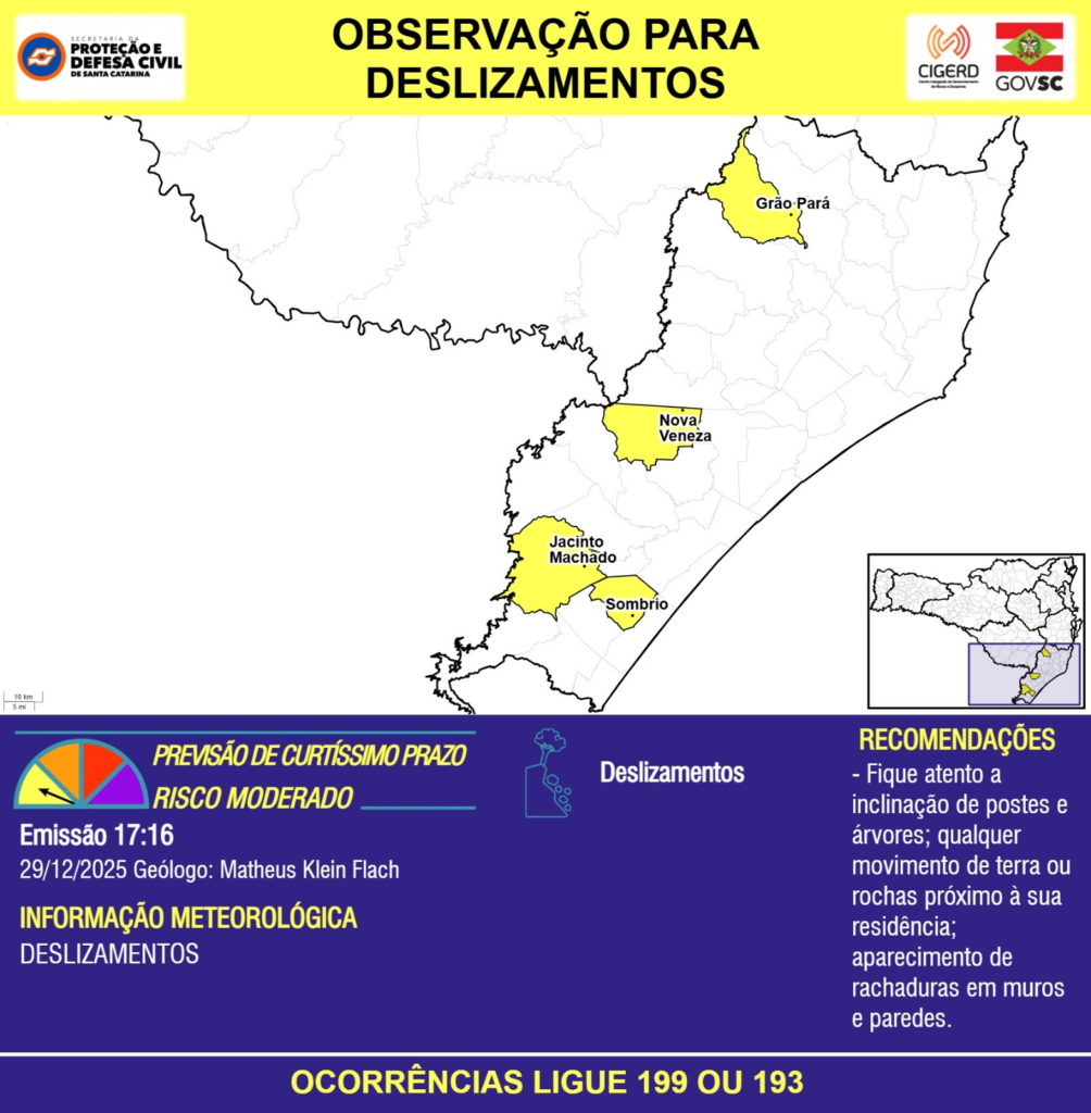 OBSERVAÇÃO – 29/12 17:16 – DESLIZAMENTOS para os municípios de Grão Pará, Jacinto Machado, Nova Veneza e Sombrio. Ocorrências ligue 199 ou 193.