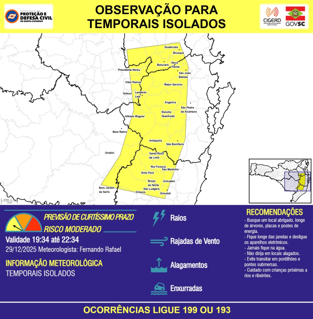 OBSERVAÇÃO – 29/12 19:34 – TEMPORAIS ISOLADOS com RAIOS, RAJADAS DE VENTO, ALAGAMENTOS pontuais e risco de ENXURRADAS para os municípios de Alfredo Wagner, Angelina, Anitápolis, Armazém, Bom Jardim da Serra, Bom Retiro, Botuverá, Braço do Norte, Brusque, Gravatal, Grão Pará, Guabiruba, Imbuia, Leoberto Leal, Major Gercino, Nova Trento, Orleans, Presidente Nereu, Rancho Queimado, Rio Fortuna, Santa Rosa de Lima, São Bonifácio, São João Batista, São Ludgero, São Martinho, São Pedro de Alcântara, Urubici, Vidal Ramos nas próximas 3 horas. Ocorrências ligue 199 ou 193.