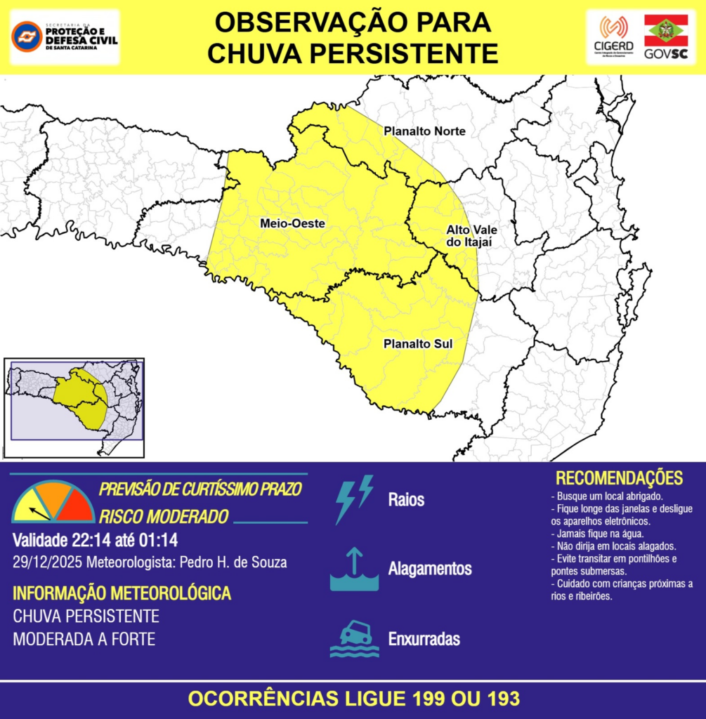 OBSERVAÇÃO – 29/12 22:14 – CHUVA PERSISTENTE de intensidade moderada a forte com RAIOS, ALAGAMENTOS pontuais e risco de ENXURRADAS para áreas das regiões do Meio-Oeste, Planalto Norte, Planalto Sul e Alto Vale do Itajaí nas próximas 3 horas. Ocorrências ligue 199 ou 193.