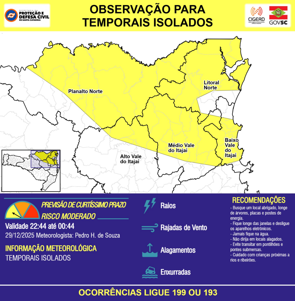 OBSERVAÇÃO – 29/12 22:44 – TEMPORAIS ISOLADOS com RAIOS, RAJADAS DE VENTO, ALAGAMENTOS pontuais e risco de ENXURRADAS para áreas das regiões do Planalto Norte, Litoral Norte, Grande Florianópolis, Baixo, Médio e Alto Vale do Itajaí nas próximas 2 horas. Ocorrências ligue 199 ou 193.