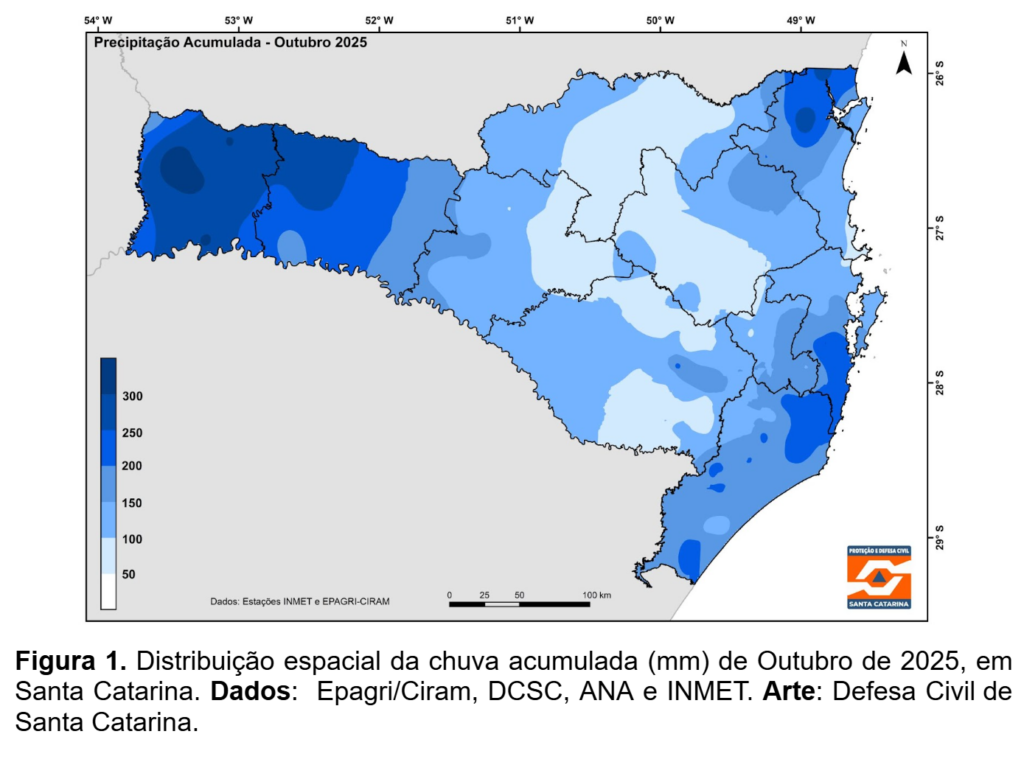 Em 2025, o estado de Santa Catarina registrou chuva abaixo da média em grande parte do território estadual. No Meio-Oeste, Planaltos e Alto Vale do Itajaí ocorreram os menores acumulados, de 50 a 150 mm, enquanto que os maiores valores foram no Oeste catarinense, oscilando entre 200 e 300 mm.
