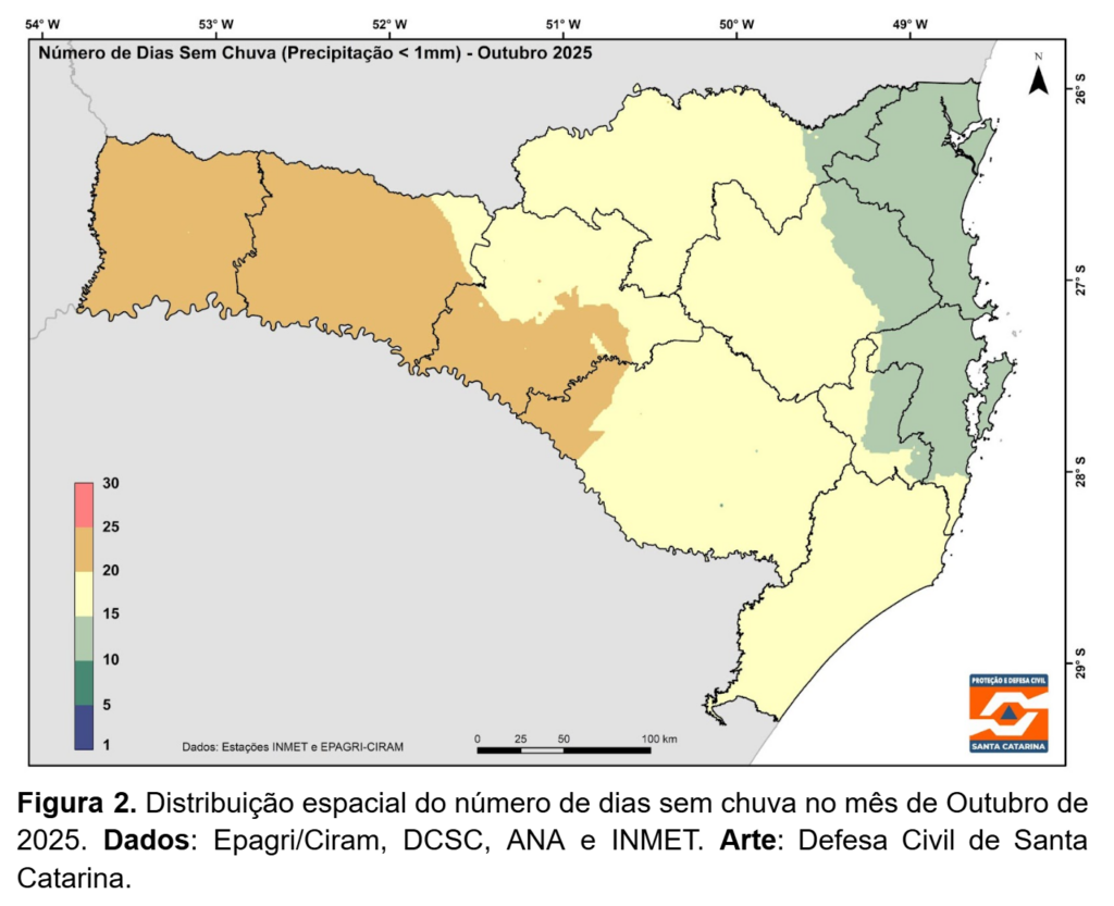 Retrospectiva Meteorológica SDC/SC: Outubro/2025 – Chuva abaixo da média e episódios de ventos intensos marcaram o mês de outubro em Santa Catarina