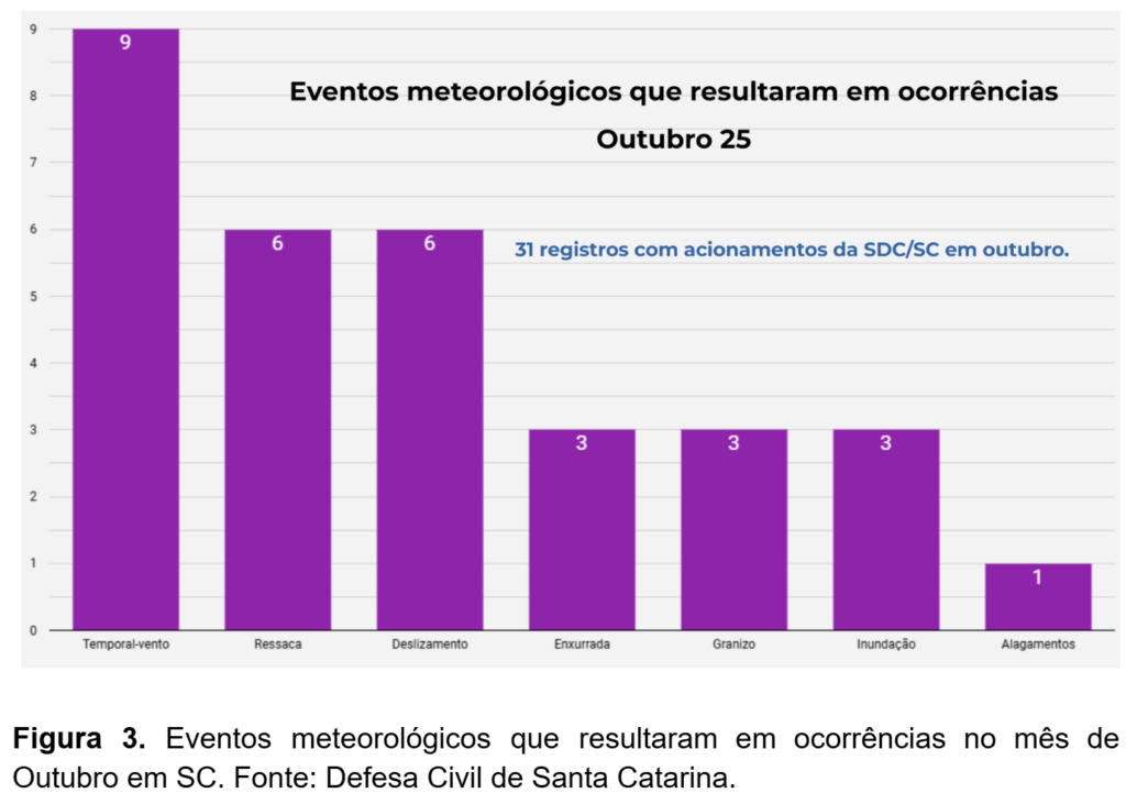 O mês foi marcado por ocorrências (Figura 3) relacionadas a ventos fortes associados aos temporais e a atuação do vento sul na região. Além disso, houve ocorrências associadas à ressaca no Litoral catarinense.
