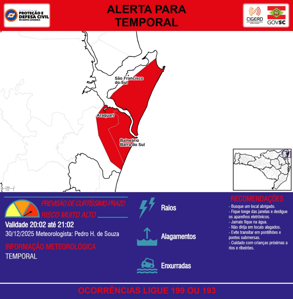 ALERTA – 30/12 20:02 – TEMPORAL com RAIOS, ALAGAMENTOS e risco de ENXURRADAS para os municípios de Araquari, Balneário Barra do Sul e São Francisco do Sul na próxima hora. Ocorrências ligue 199 ou 193.