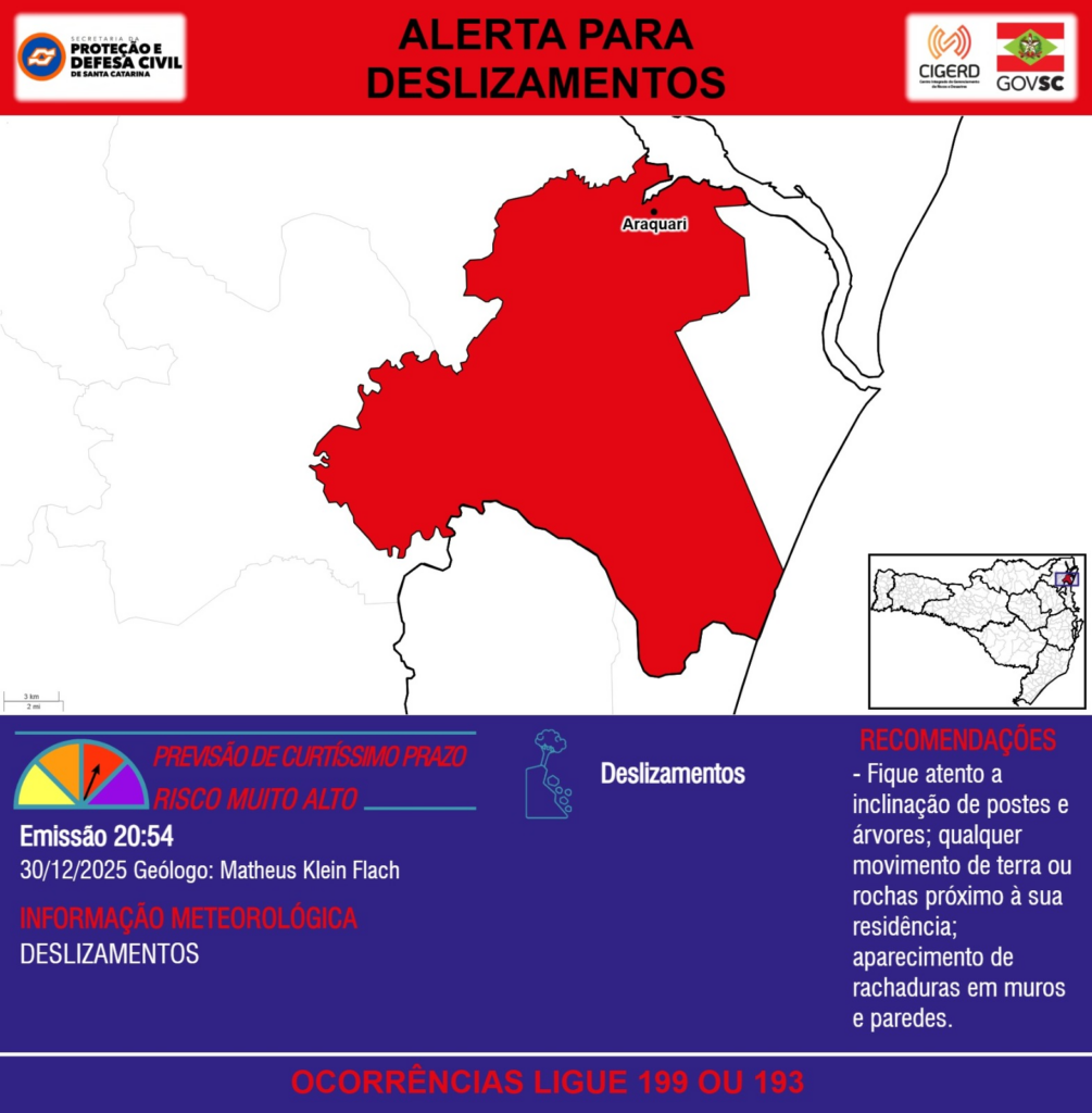 ALERTA – 30/12 20:54 – DESLIZAMENTOS para o município de Araquari. Ocorrências ligue 199 ou 193.