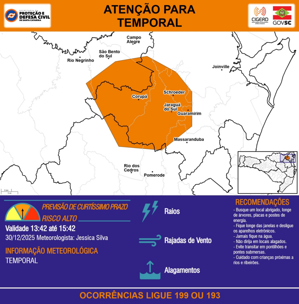 ATENÇÃO – 30/12 13:42 – TEMPORAL com RAIOS, RAJADAS DE VENTO e ALAGAMENTOS para os municípios de Blumenau, Campo Alegre, Corupá, Guaramirim, Jaraguá do Sul, Joinville, Massaranduba, Pomerode, Rio Negrinho, Rio dos Cedros, Schroeder e São Bento do Sul nas próximas 2 horas. Ocorrências ligue 199 ou 193.
