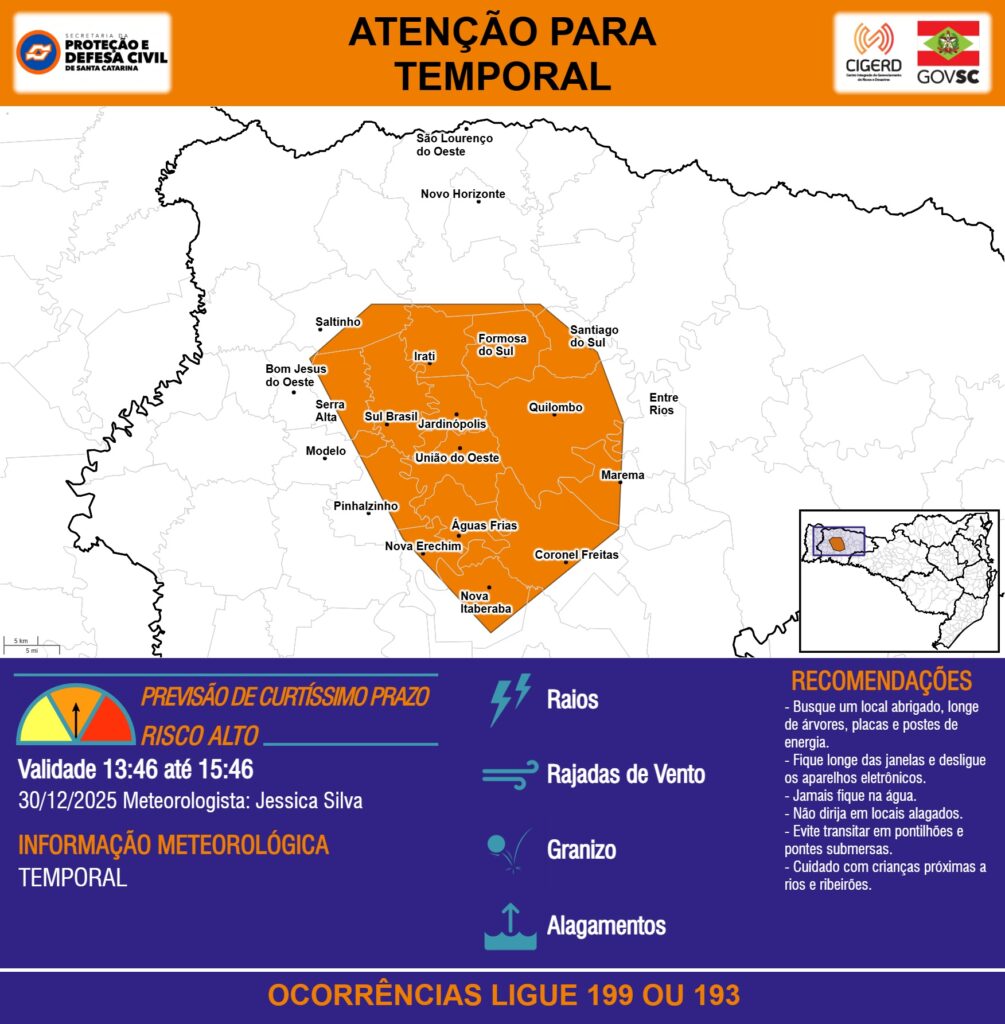 ATENÇÃO – 30/12 13:46 – TEMPORAL com RAIOS, RAJADAS DE VENTO, GRANIZO e ALAGAMENTOS para os municípios de Bom Jesus do Oeste, Chapecó, Coronel Freitas, Entre Rios, Formosa do Sul, Irati, Jardinópolis, Marema, Modelo, Nova Erechim, Nova Itaberaba, Novo Horizonte, Pinhalzinho, Quilombo, Saltinho, Santiago do Sul, Serra Alta, Sul Brasil, São Lourenço do Oeste, União do Oeste e Águas Frias nas próximas 2 horas. Ocorrências ligue 199 ou 193.