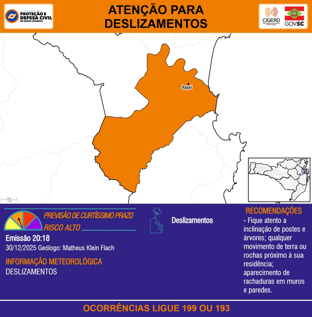 ATENÇÃO – 30/12 20:18 – DESLIZAMENTOS para o município de Itajaí. Ocorrências ligue 199 ou 193.