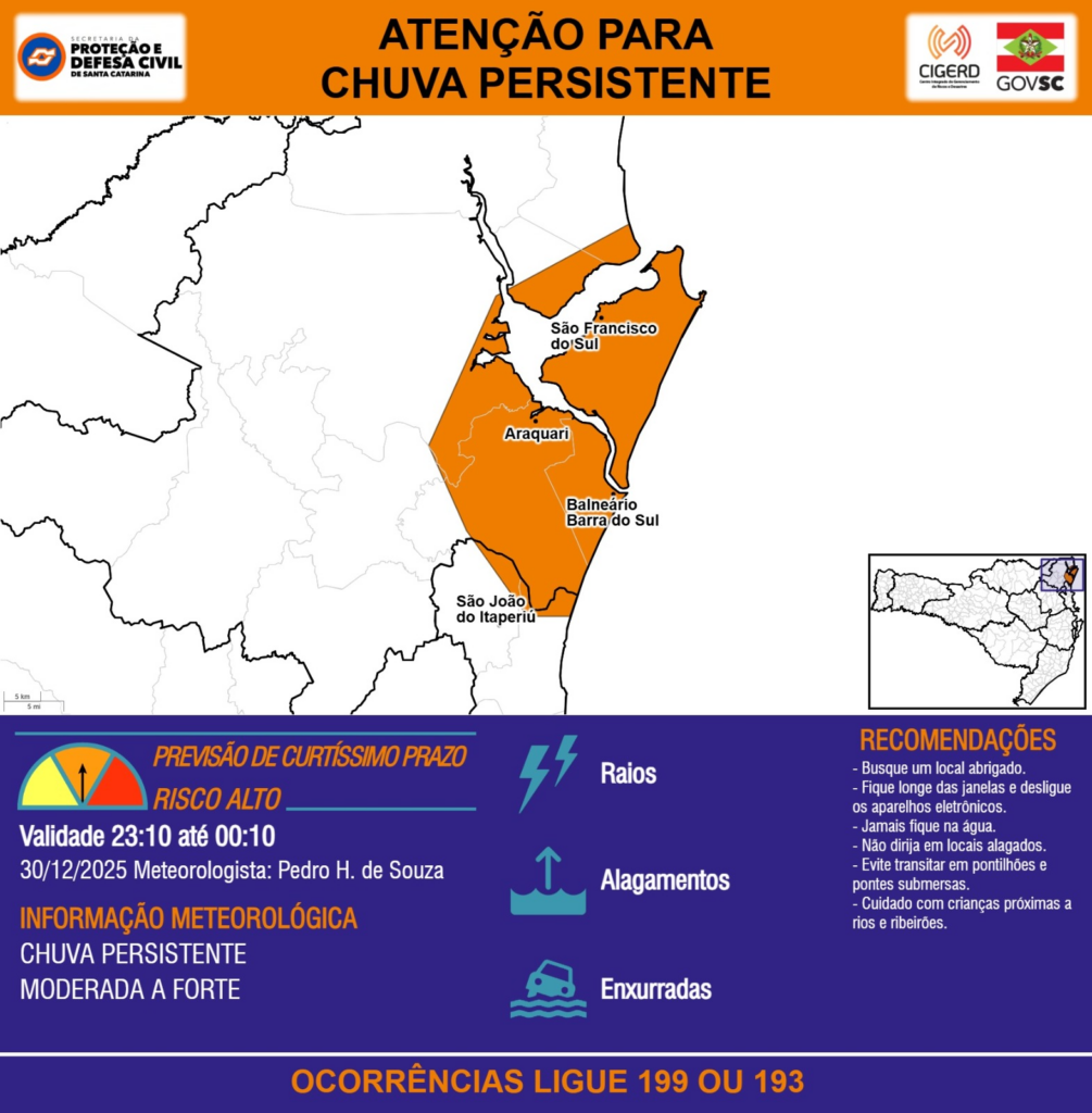 ATENÇÃO – 30/12 23:10 – CHUVA PERSISTENTE de intensidade moderada a forte com RAIOS, ALAGAMENTOS e risco de ENXURRADAS para os municípios de Araquari, Balneário Barra do Sul, São Francisco do Sul e São João do Itaperiú na próxima hora. Ocorrências ligue 199 ou 193.