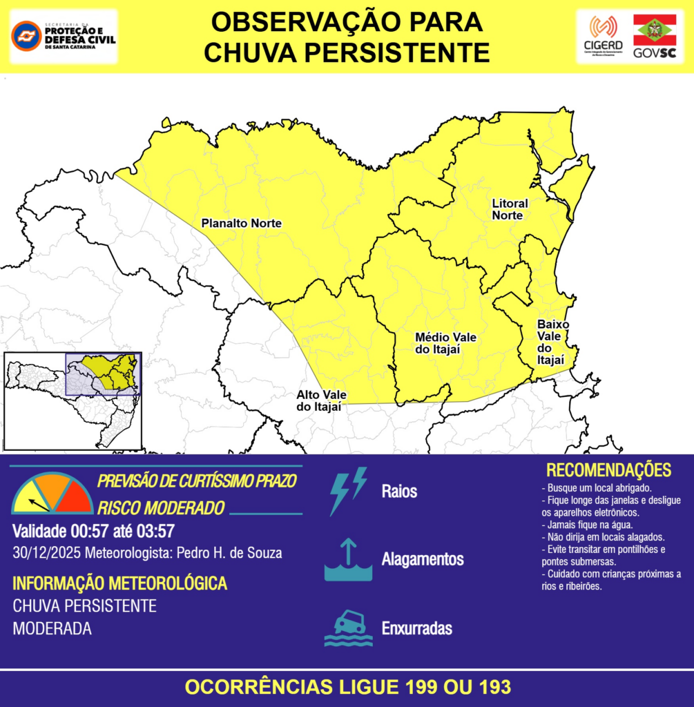 OBSERVAÇÃO – 30/12 00:57 – CHUVA PERSISTENTE de intensidade moderada com RAIOS, ALAGAMENTOS pontuais e risco de ENXURRADAS para áreas das regiões do Planalto Norte, Litoral Norte, Baixo, Médio e Alto Vale do Itajaí nas próximas 3 horas. Ocorrências ligue 199 ou 193.