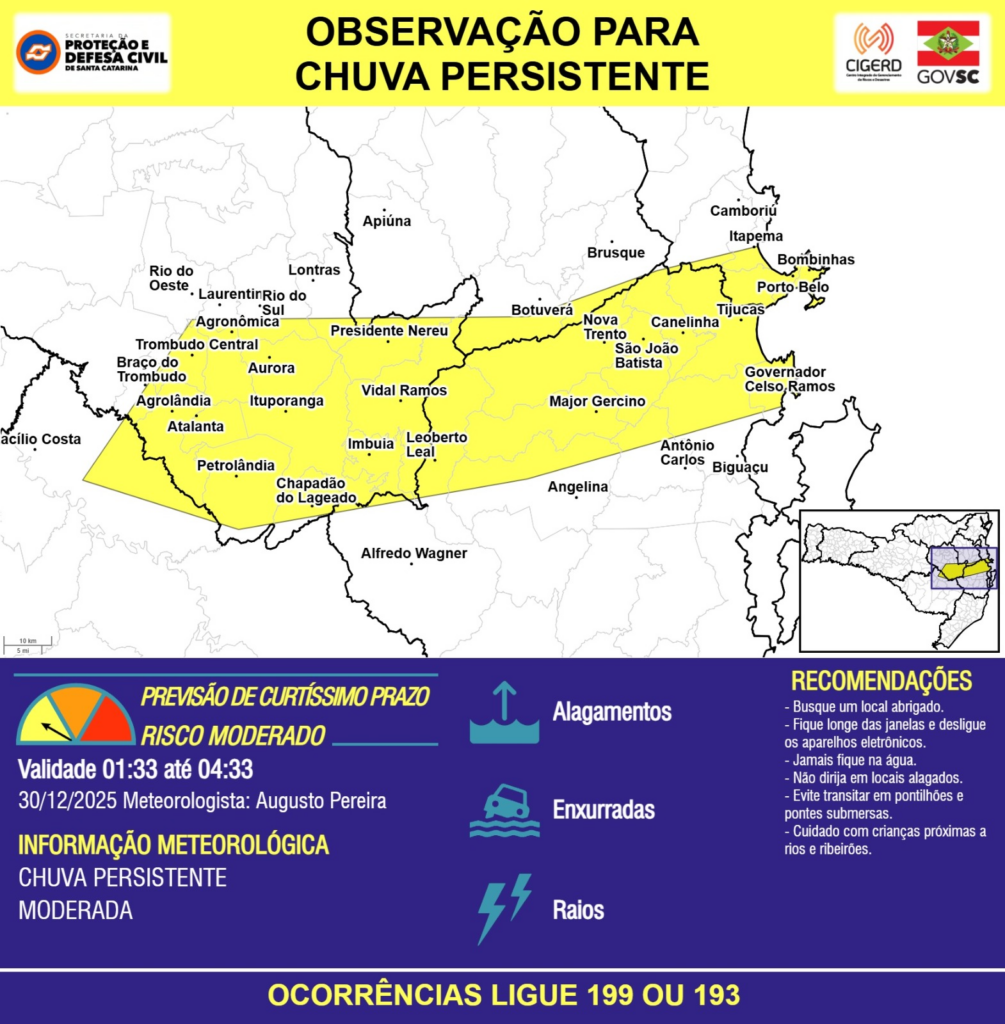 OBSERVAÇÃO – 30/12 01:33 – CHUVA PERSISTENTE de intensidade moderada com RAIOS, ALAGAMENTOS pontuais e risco de ENXURRADAS para os municípios de Agrolândia, Agronômica, Alfredo Wagner, Angelina, Antônio Carlos, Apiúna, Atalanta, Aurora, Biguaçu, Bombinhas, Botuverá, Braço do Trombudo, Brusque, Camboriú, Canelinha, Chapadão do Lageado, Governador Celso Ramos, Imbuia, Itapema, Ituporanga, Laurentino, Leoberto Leal, Lontras, Major Gercino, Nova Trento, Otacílio Costa, Petrolândia, Porto Belo, Presidente Nereu, Rio do Oeste, Rio do Sul, São João Batista, Tijucas, Trombudo Central e Vidal Ramos nas próximas 3 horas. Ocorrências ligue 199 ou 193.