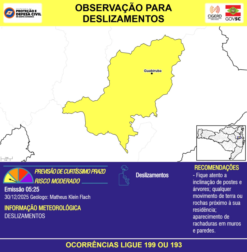 OBSERVAÇÃO – 30/12 05:25 – DESLIZAMENTOS para o município de Guabiruba. Ocorrências ligue 199 ou 193.
