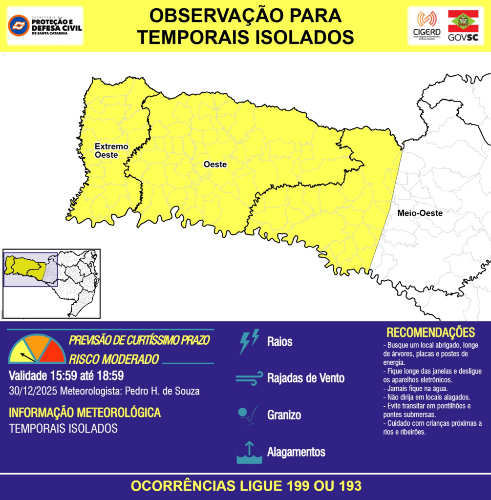 OBSERVAÇÃO – 30/12 15:59 – TEMPORAIS ISOLADOS com RAIOS, RAJADAS DE VENTO, GRANIZO e ALAGAMENTOS pontuais para as regiões do Extremo Oeste, Oeste e áreas do Meio-Oeste nas próximas 3 horas. Ocorrências ligue 199 ou 193.