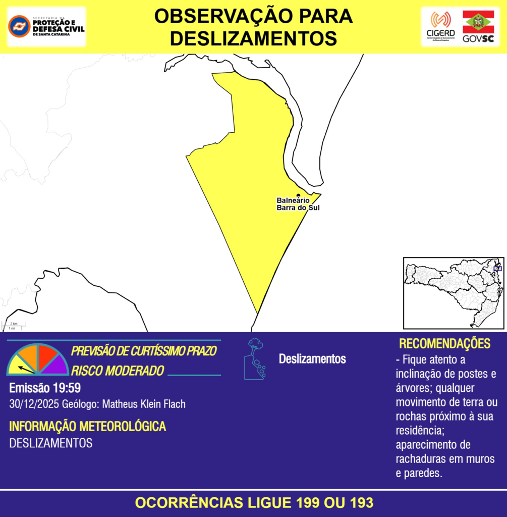 OBSERVAÇÃO – 30/12 19:59 – DESLIZAMENTOS para o município de Balneário Barra do Sul. Ocorrências ligue 199 ou 193.