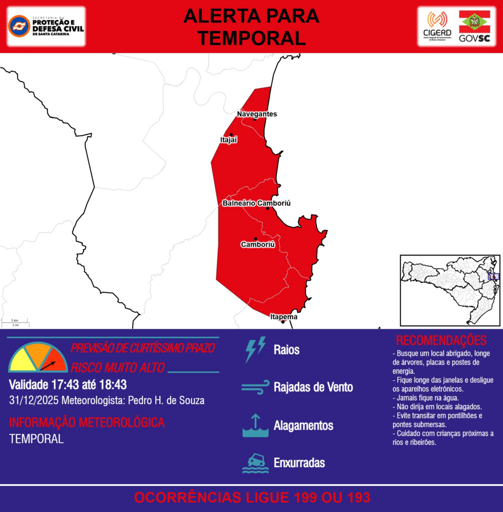 ALERTA – 31/12 17:43 – TEMPORAL com RAIOS, RAJADAS DE VENTO, ALAGAMENTOS e risco de ENXURRADAS para os municípios de Balneário Camboriú, Camboriú, Itajaí, Itapema e Navegantes na próxima hora. Ocorrências ligue 199 ou 193.