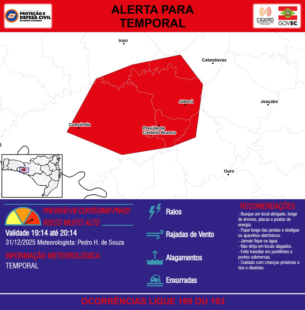 ALERTA – 31/12 19:14 – TEMPORAL com RAIOS, RAJADAS DE VENTO, ALAGAMENTOS e risco de ENXURRADAS para áreas da região do Meio-Oeste na próxima hora. Ocorrências ligue 199 ou 193.