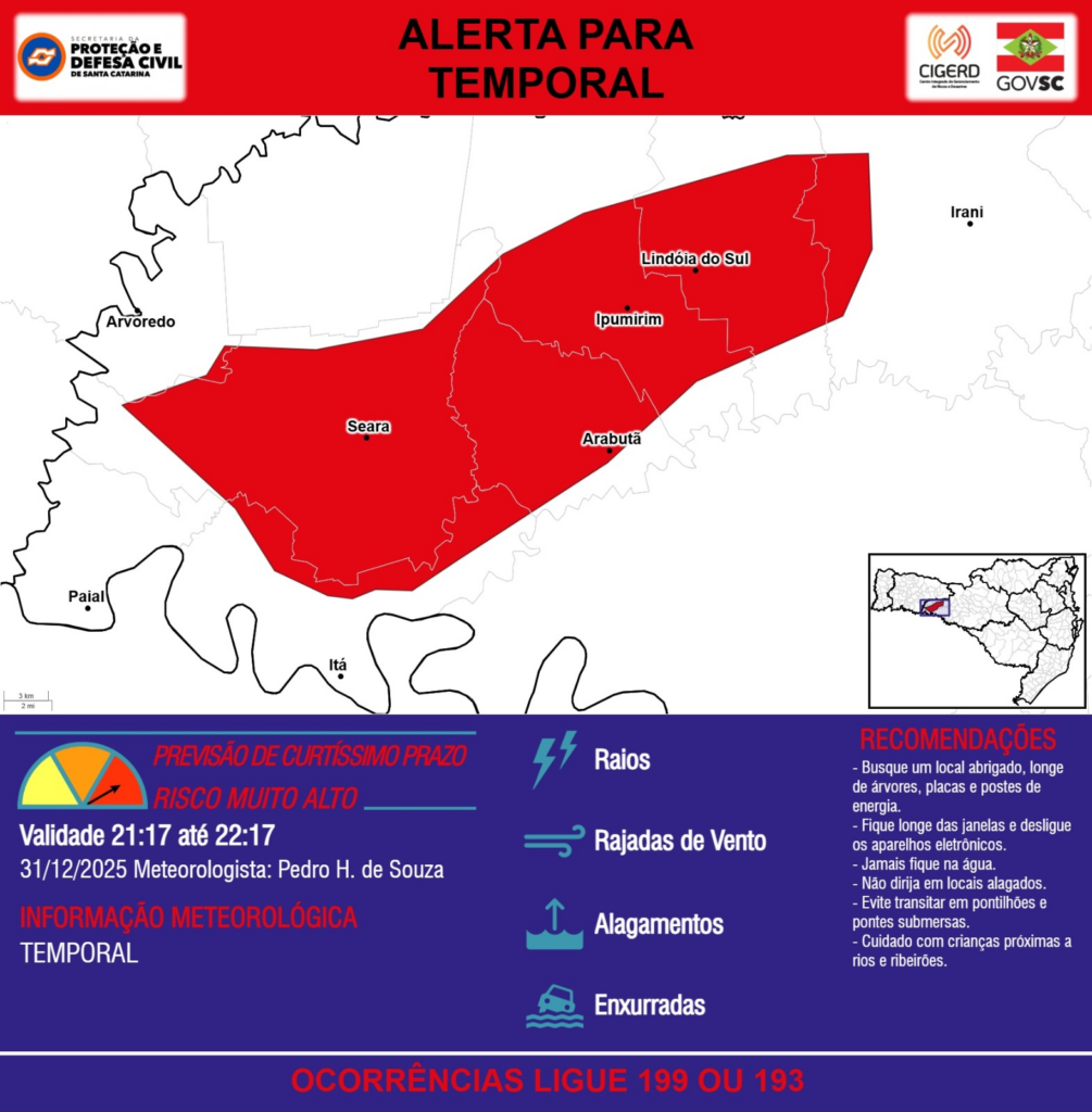 ALERTA – 31/12 21:17 – TEMPORAL com RAIOS, RAJADAS DE VENTO, ALAGAMENTOS e risco de ENXURRADAS para os municípios de Arabutã, Arvoredo, Ipumirim, Irani, Itá, Lindóia do Sul, Paial e Seara na próxima hora. Ocorrências ligue 199 ou 193.