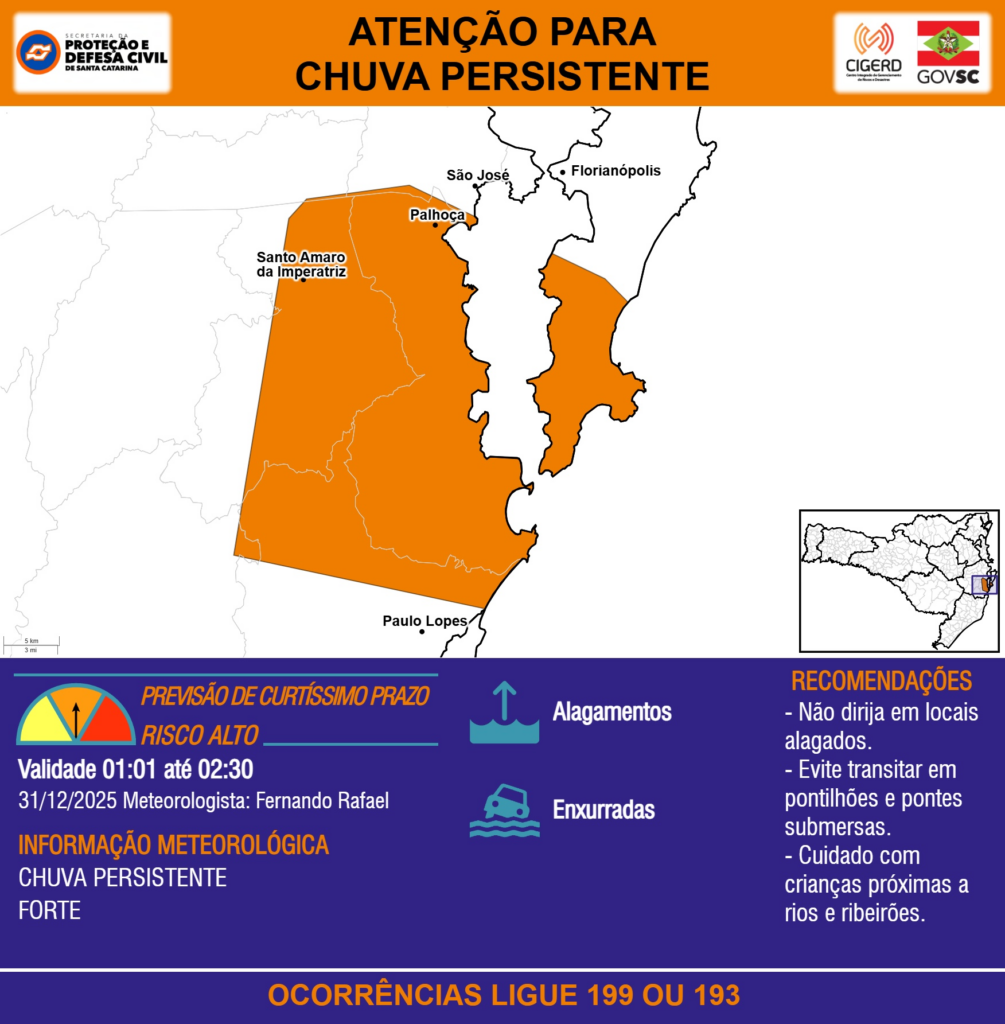 ATENÇÃO – 31/12 01:01 – CHUVA PERSISTENTE de intensidade forte com ALAGAMENTOS e risco de ENXURRADAS para os municípios de Florianópolis, Palhoça, Paulo Lopes, Santo Amaro da Imperatriz, São José na próxima hora. Ocorrências ligue 199 ou 193.