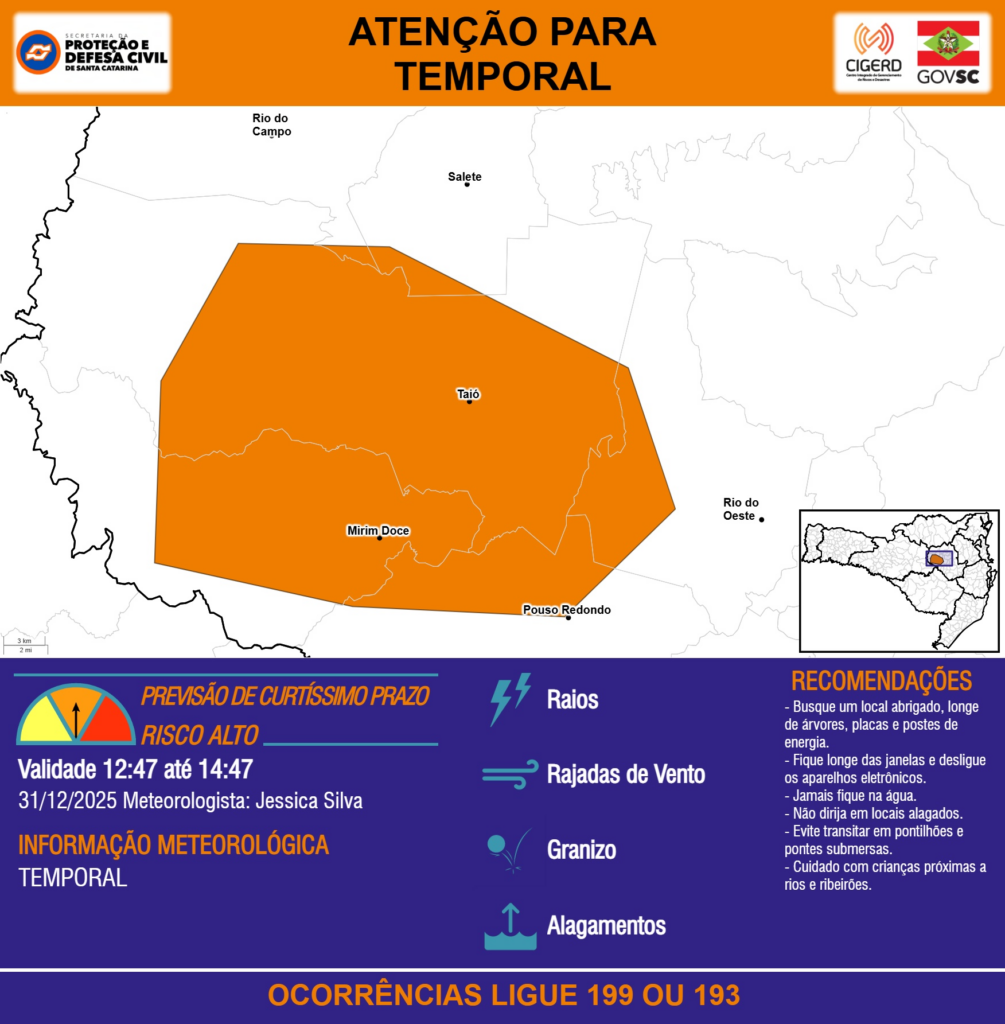 ATENÇÃO – 31/12 12:47 – TEMPORAL com RAIOS, RAJADAS DE VENTO, GRANIZO e ALAGAMENTOS para os municípios de Mirim Doce, Pouso Redondo, Rio do Campo, Rio do Oeste, Salete e Taió nas próximas 2 horas. Ocorrências ligue 199 ou 193.