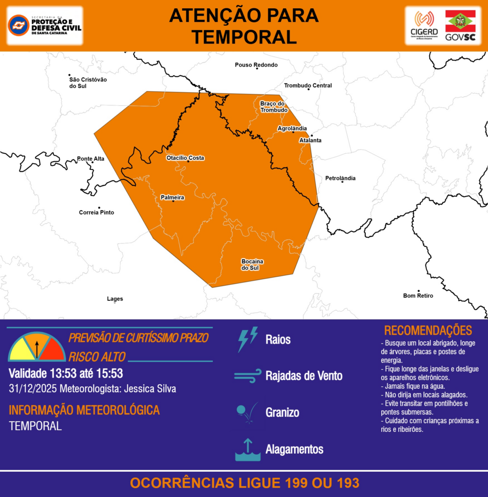 ATENÇÃO – 31/12 13:53 – TEMPORAL com RAIOS, RAJADAS DE VENTO, GRANIZO e ALAGAMENTOS para os municípios de Agrolândia, Atalanta, Bocaina do Sul, Bom Retiro, Braço do Trombudo, Correia Pinto, Lages, Otacílio Costa, Palmeira, Petrolândia, Ponte Alta, Pouso Redondo, São Cristóvão do Sul e Trombudo Central nas próximas 2 horas. Ocorrências ligue 199 ou 193.
