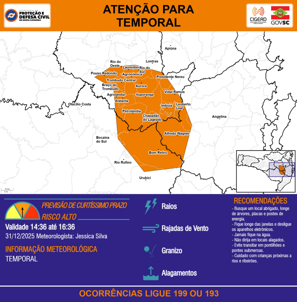 ATENÇÃO – 31/12 14:36 – TEMPORAL com RAIOS, RAJADAS DE VENTO, GRANIZO e ALAGAMENTOS para os municípios de Agrolândia, Agronômica, Alfredo Wagner, Angelina, Apiúna, Atalanta, Aurora, Bocaina do Sul, Bom Retiro, Braço do Trombudo, Chapadão do Lageado, Imbuia, Ituporanga, Laurentino, Leoberto Leal, Lontras, Otacílio Costa, Petrolândia, Pouso Redondo, Presidente Nereu, Rio Rufino, Rio do Oeste, Rio do Sul, Trombudo Central, Urubici e Vidal Ramos nas próximas 2 horas. Ocorrências ligue 199 ou 193.